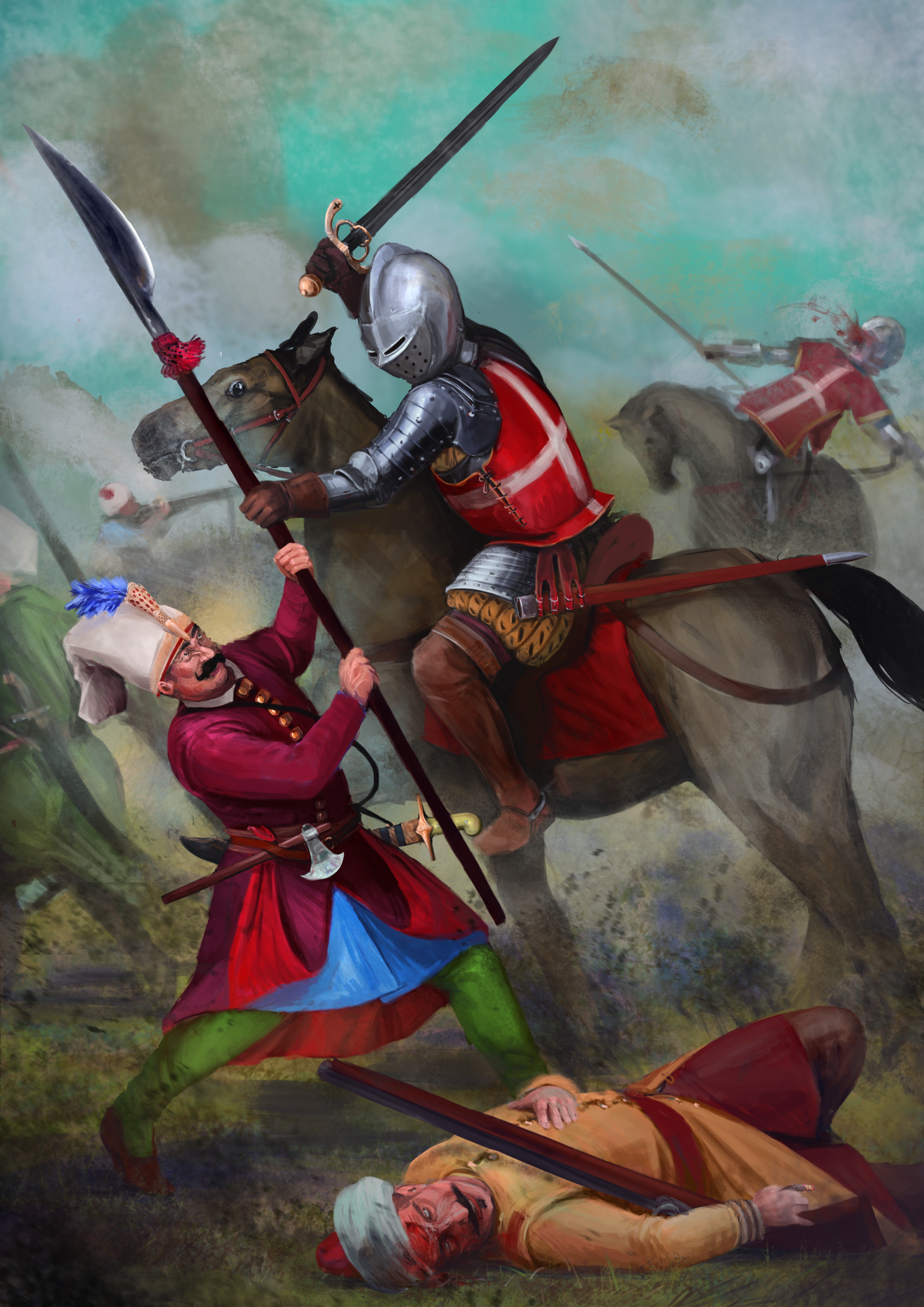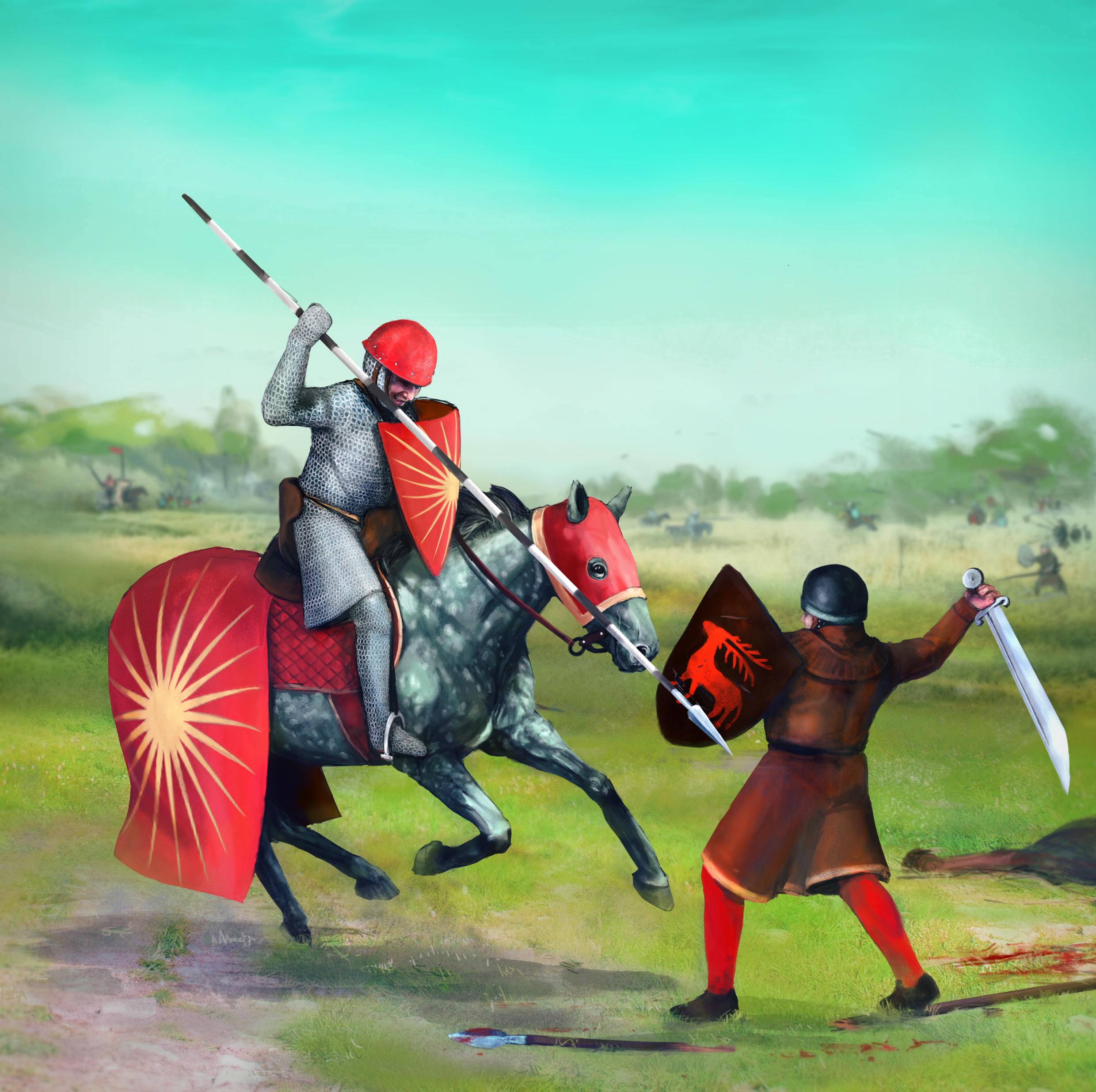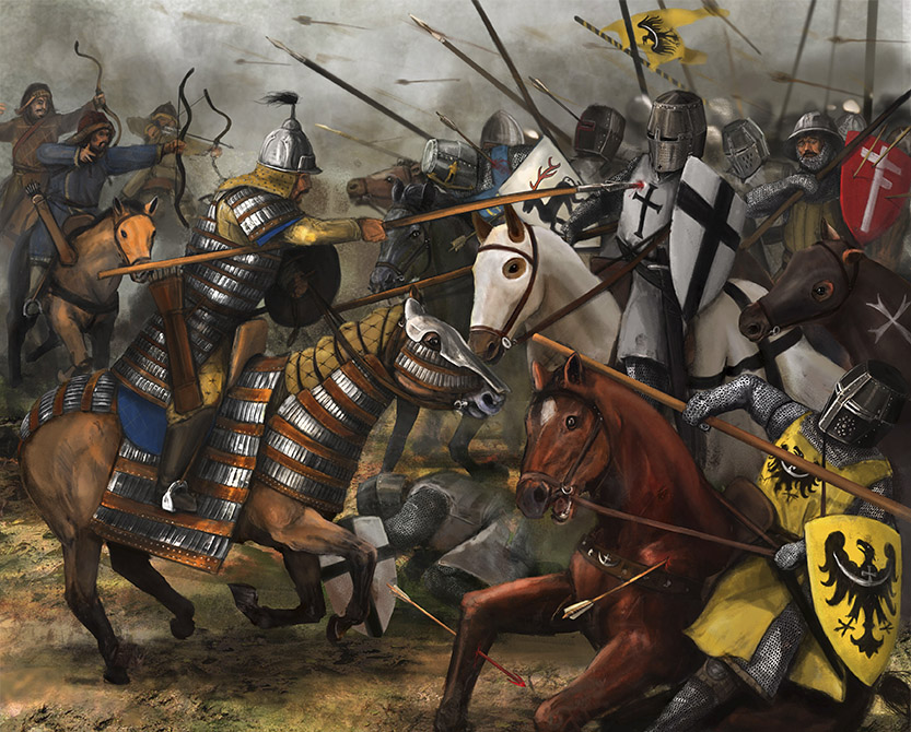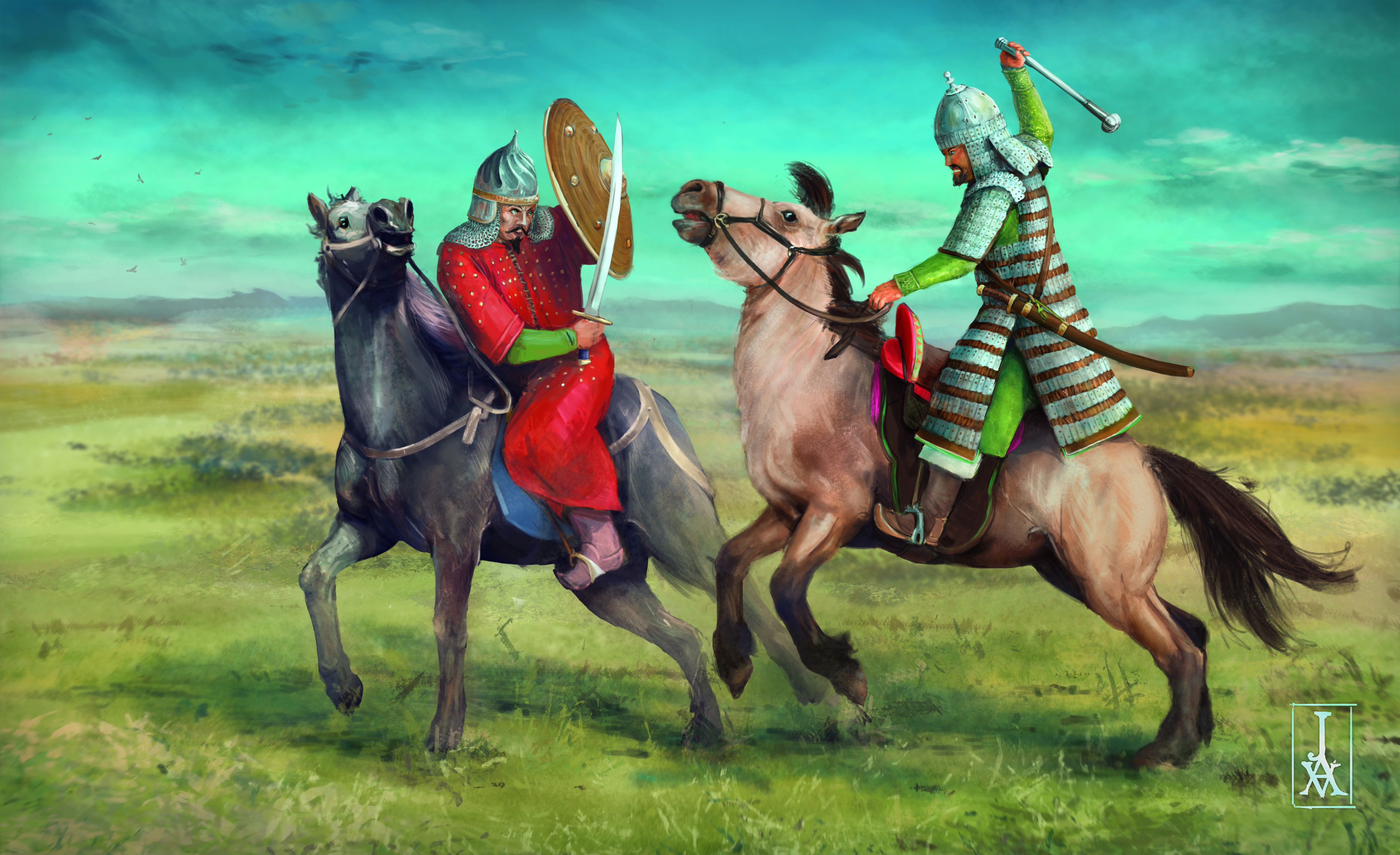 Combate entre jinete mongol de la Horda de Oro (derecha) y timúrida (derecho). Ambos imperios descienden de la división del Imperio Mongol de Gengis Khan en territorios menores.